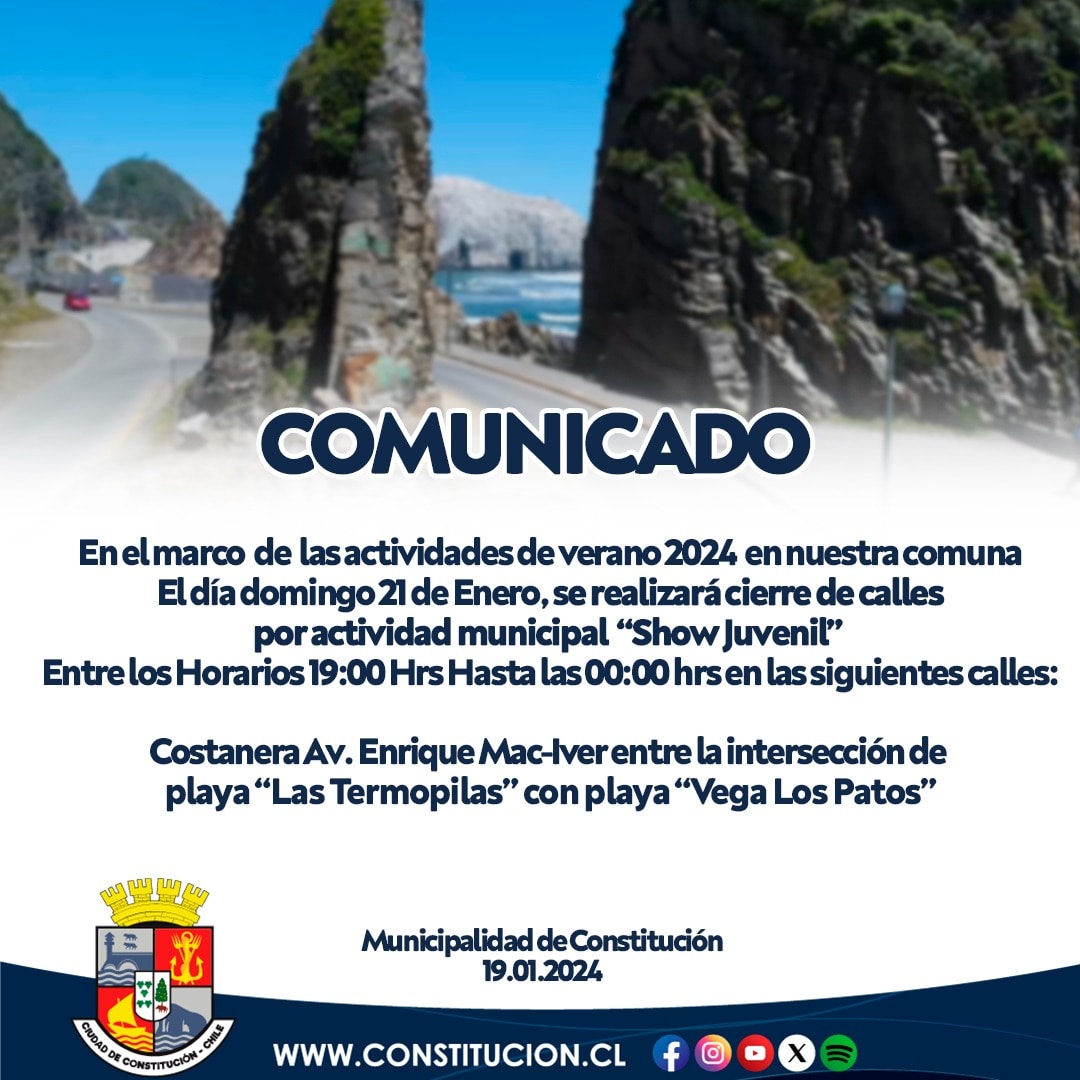 En el marco de las actividades de verano 2024 en la comuna de Constitución, es que el día domingo 21 de Enero, se realizará cierre de calles por actividad municipal “Show Juvenil”