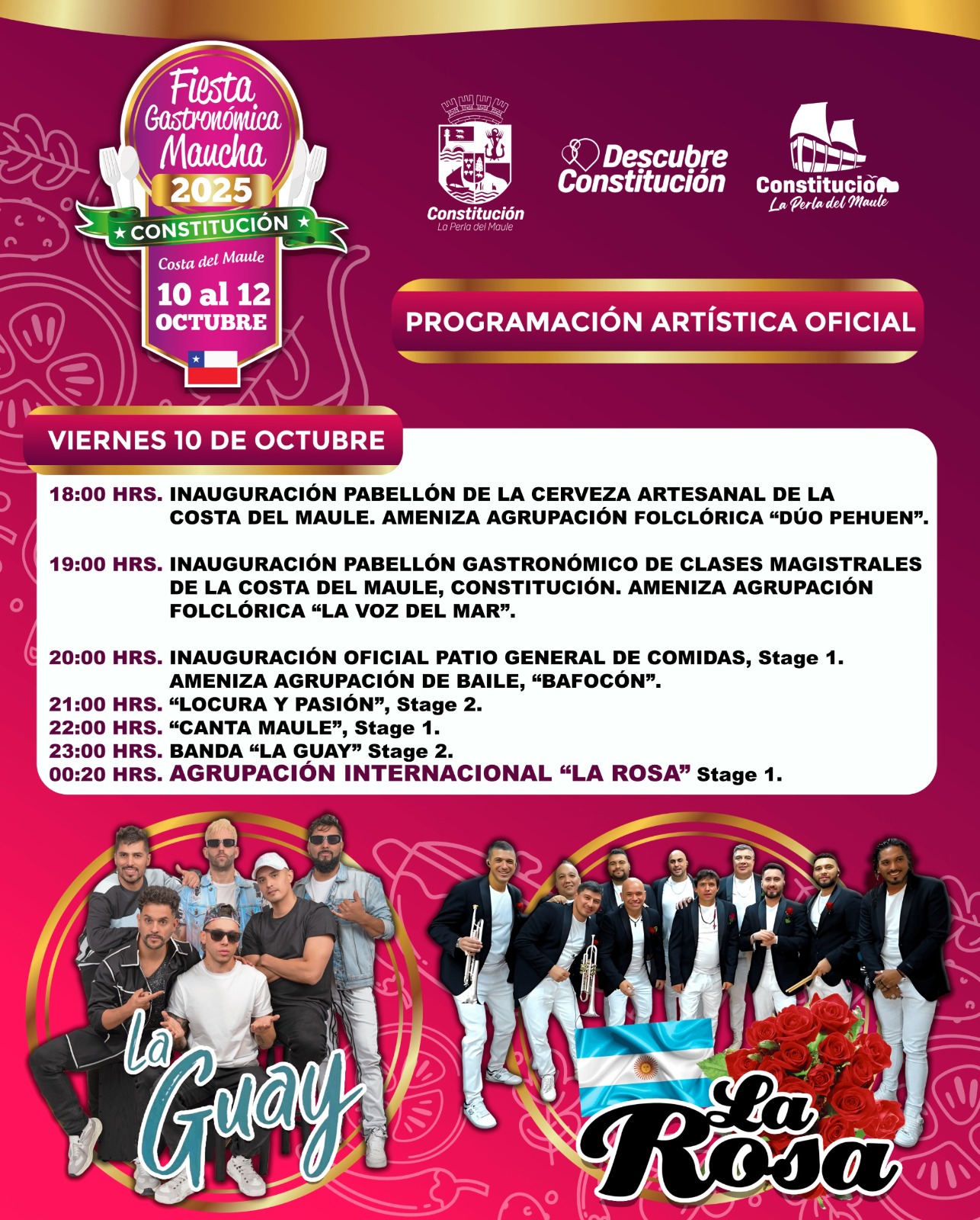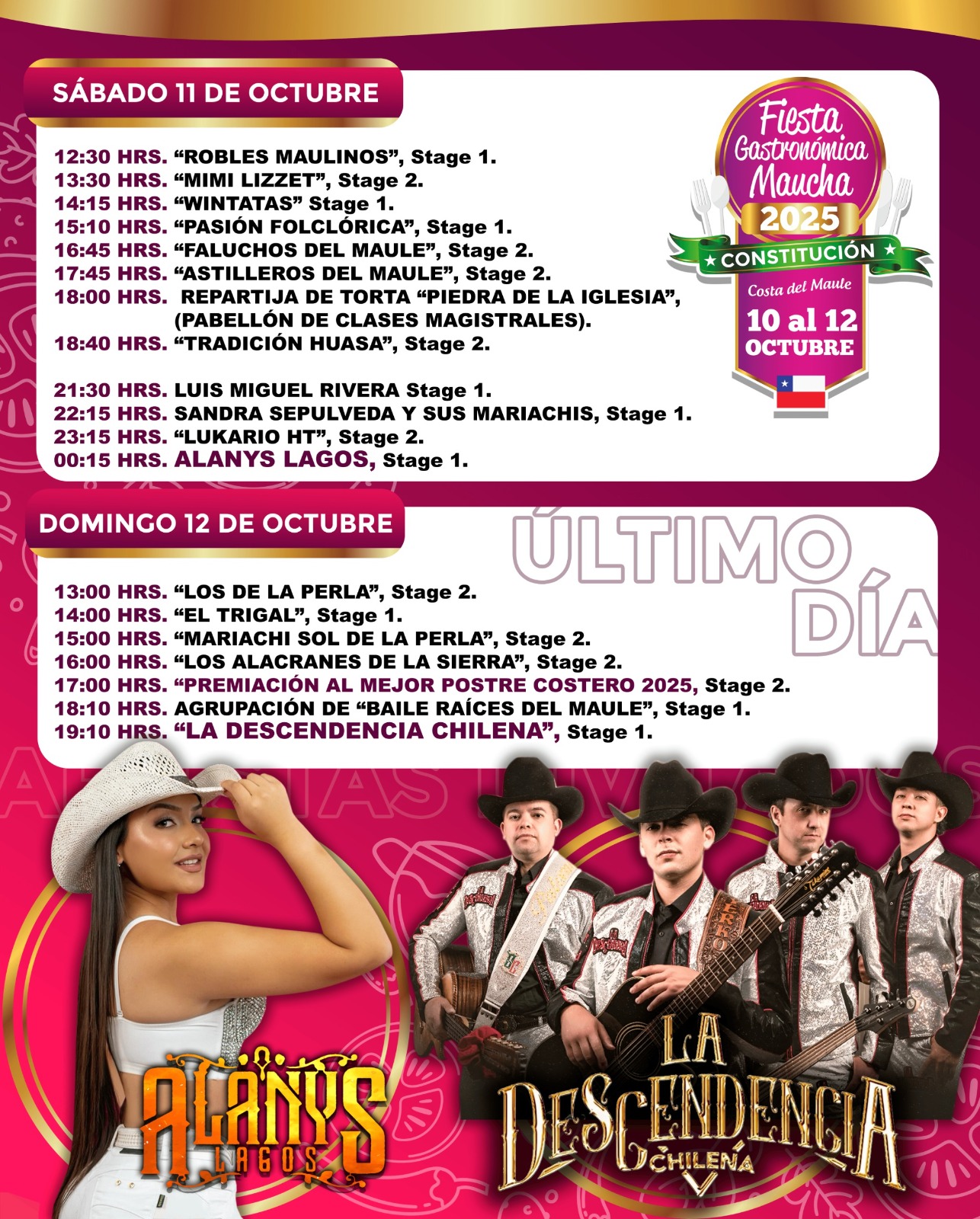 El viernes 10 de octubre el gran show estará a cargo de La Guay Cumbia, mientras que el sábado 11 brillará Alanys Lagos, y el domingo 12 será el turno de La Descendia Chilena. El cierre estelar lo entregará el grupo internacional argentino “La Rosa”, que pondrá ritmo y sabor al fin de semana.