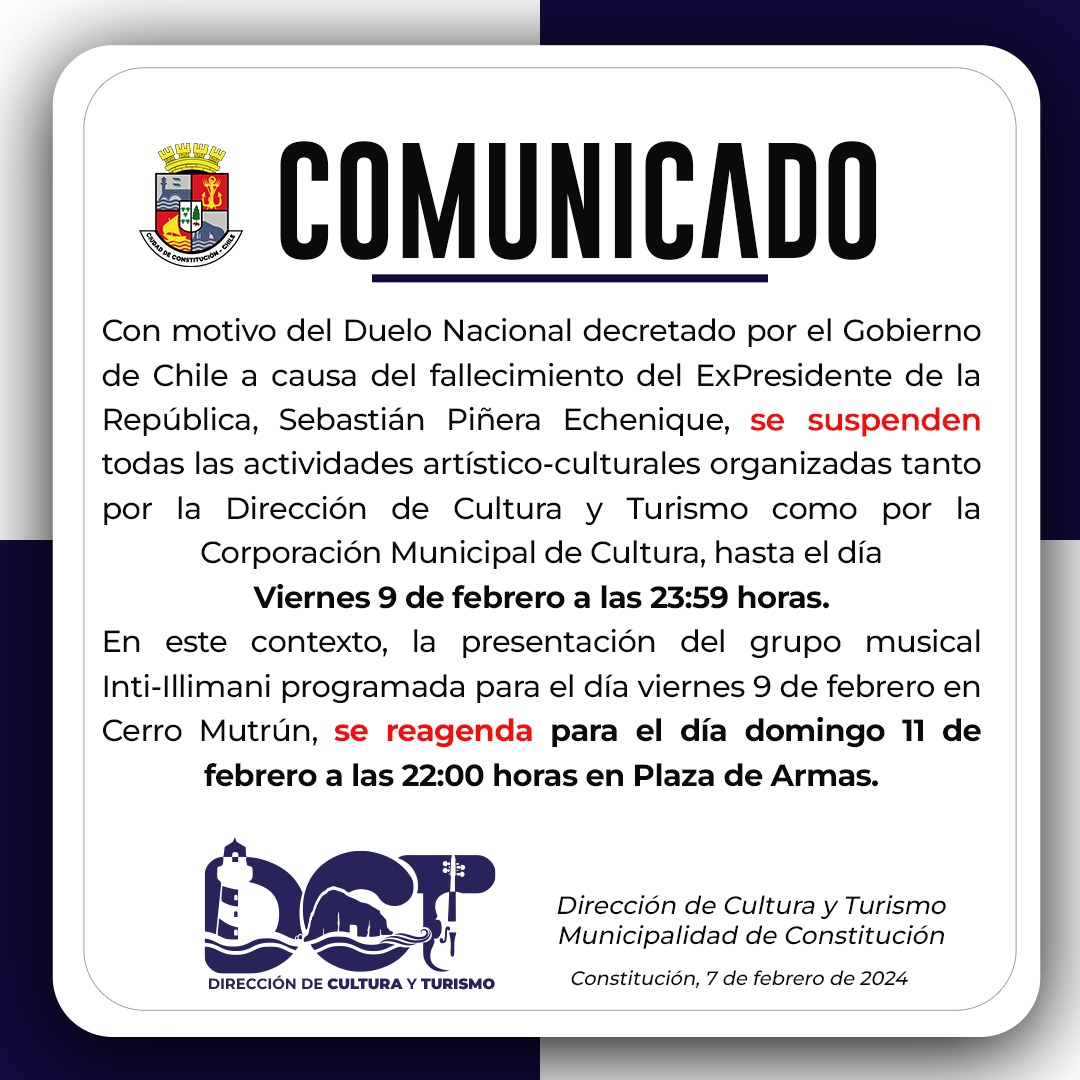 InicioCrónicaMunicipalidad de Constitución suspende todas sus actividades por Duelo Nacional CrónicaTitulares 7 de febrero de 2024 Municipalidad de Constitución suspende todas sus actividades por Duelo Nacional Cuota FacebookTwitterWhatsApp - Publicidad - Mantente Informado 3,107FansMe gusta Noticias Relacionadas Crónica “Cuando un estudiante falta, pierde oportunidades que difícilmente se podrán recuperar” 7 de octubre de 2025 Crónica Fiesta Gastronómica Maucha 2025 promete tres días de sabores, música y tradiciones en Constitución 7 de octubre de 2025 Crónica Constitución lleva sus sabores y atractivos a la Feria VYVA 2025, el evento turístico más importante del país 6 de octubre de 2025 Crónica Universidad de Talca da inicio a la campaña de juguetes para el “Tren de Navidad” 2025 5 de octubre de 2025 Crónica FOSIS impulsa sueños y emprendimientos en el Maule: comienza la etapa de compras 2025 5 de octubre de 2025