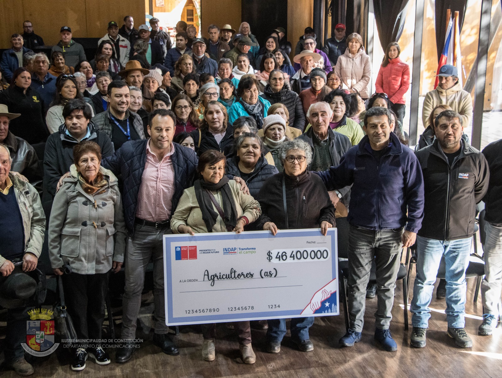 En el salón del Centro Cultural Cultural de Constitución, el alcalde Fabián Pérez junto al director regional de Indap Jorge Céspedes, hicieron entrega de 46 millones de pesos, lo que beneficiará a 320 usuarios de PRODESAL